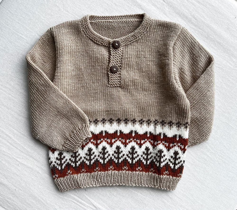 Mønstret med rævehoveder og grantræer er strikket efter diagram.