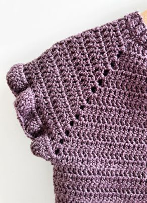 Den er hæklet oppefra-ned med udtagninger til raglan, hvorefter ærmemaskerne hviler og kroppen hækles færdig .