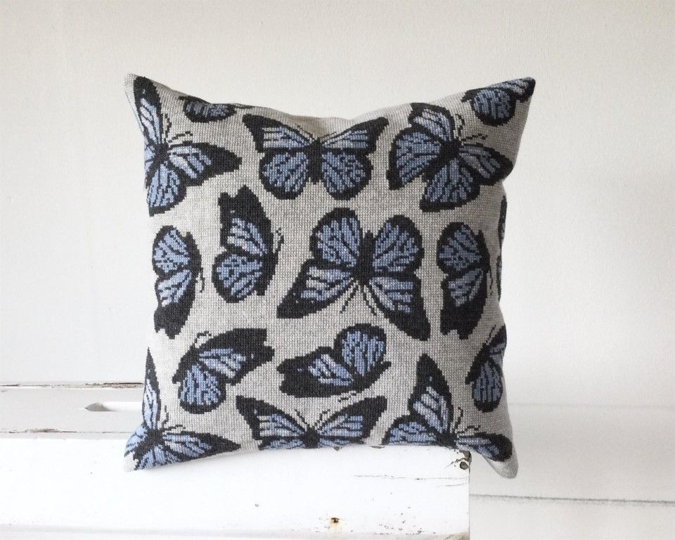 Blå sommerfugle er en pude bestående af korssting, designet af Søren Nielsen for BALDYRE. Pudens motiv er smukke lyseblå sommerfugle på en svag grå baggrund.