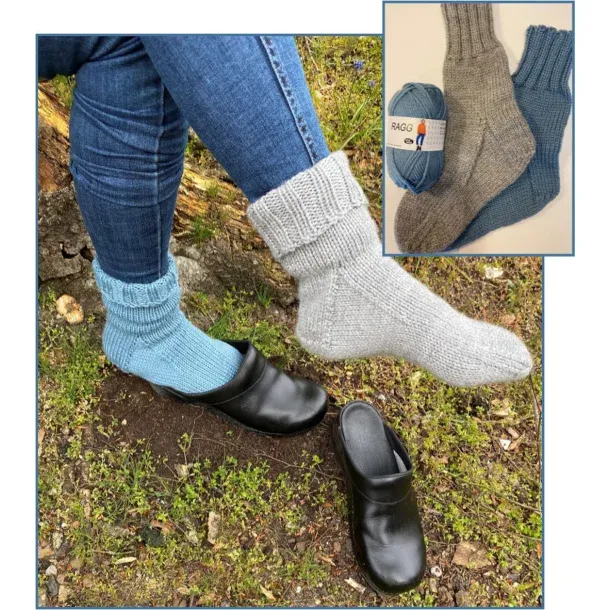 Sokkerne strikkes i Ragg garn fra Hjertegarn, som fås i ensfarvet og multifarver.