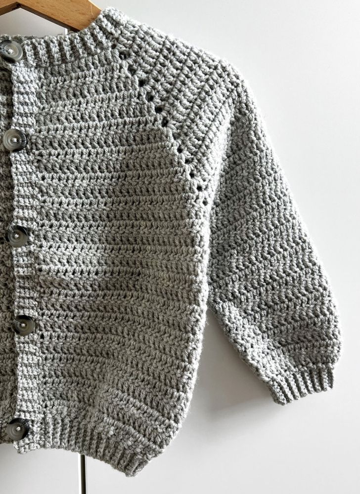 Cardiganen er hæklet oppefra-ned med udtagninger til raglan, hvorefter ærmemaskerne hviler og krop og ærmer hækles færdig. Der hækles til sidst ribkanter.