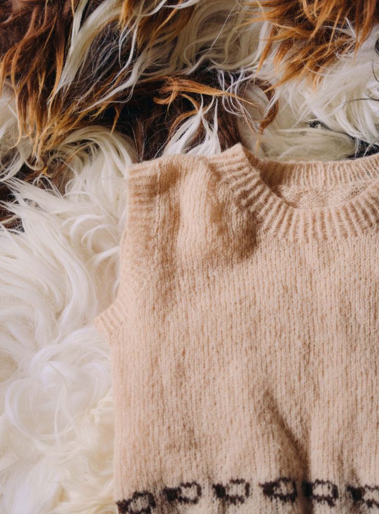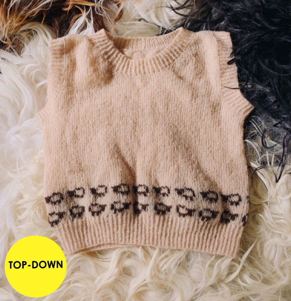 Borten på ryg/forstykke, strikkes efter diagram før der afsluttes med rib. Afslutningsvist samles der masker op til rib i hals og ærmegab.