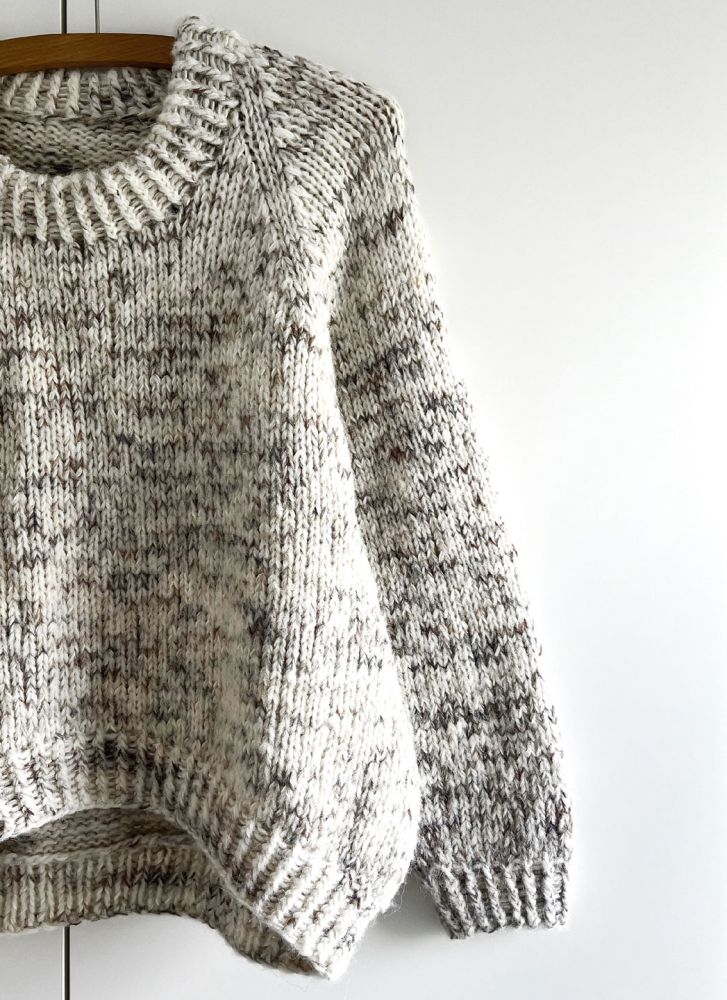 Sweateren strikkes i dobbeltråd. En tråd Børstet Uld og en tråd Armonia Handdyed.